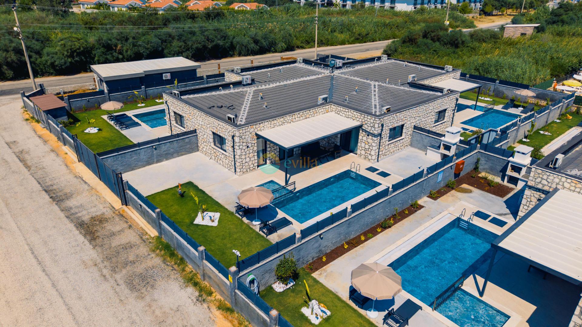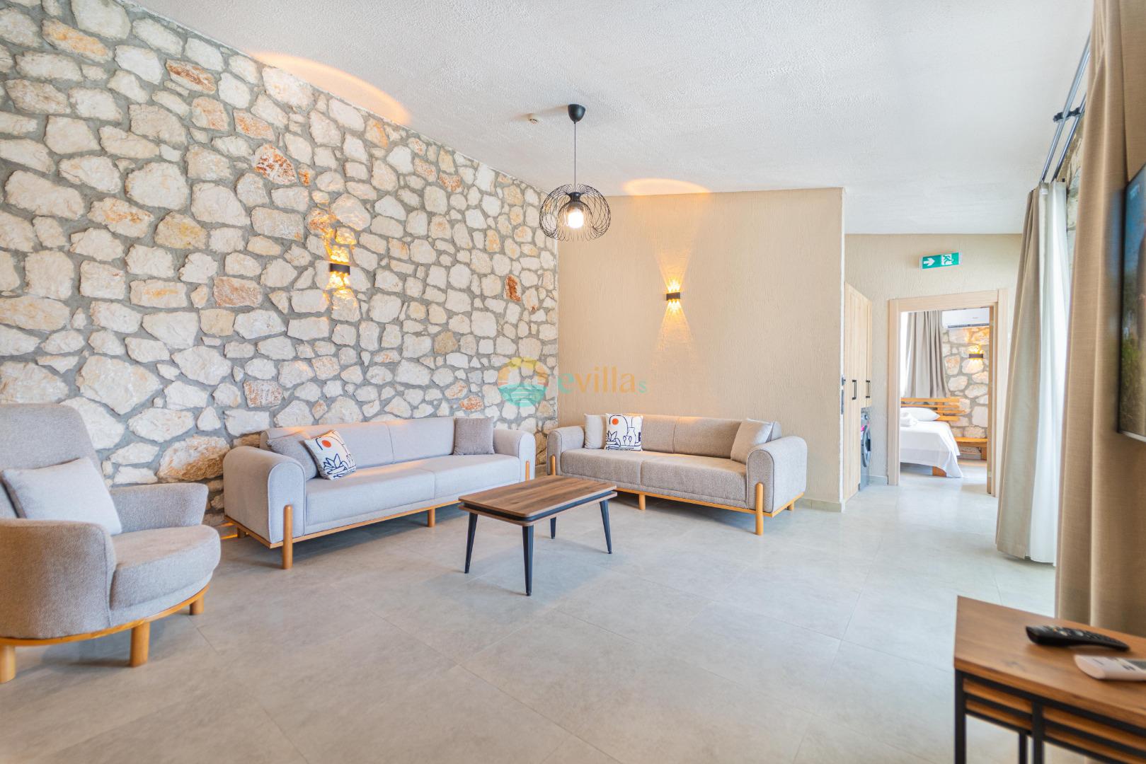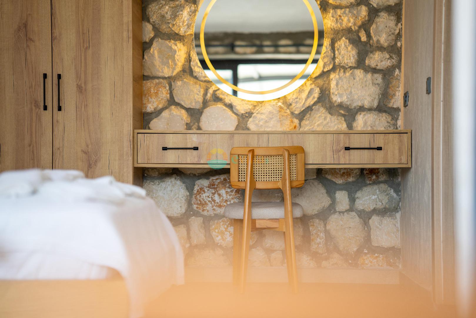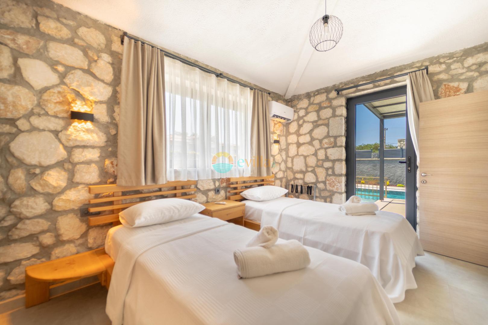 Taş mimariye sahip villamız 4 kişi kapasiteli olup içerisinde 2 yatak odası ve 2 WC-DUŞ mevcuttur. Girişte açık mutfak, salon, TV ve klima yer almaktadır. Birinci yatak odası içerisinde iki tek kişilik yatak, WC-DUŞ ve klima bulunurken, diğer oda içerisinde ise bir çift kişilik yatak, WC-DUŞ ve klima mevcuttur.