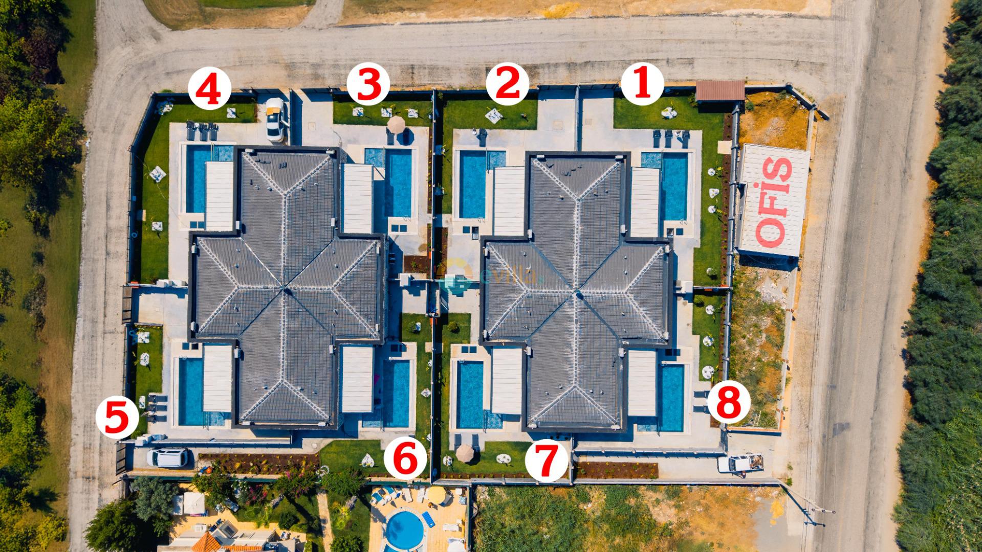 8 villadan oluşan kompleksimiz de tek çekim kullanılmış olup iç detayları tamamen aynıdır. Sadece havuz terası ve yeşil çim alanlarında farklılık bulunmaktadır. Bazı çim alanları küçük bazıları ise nispeten geniştir.