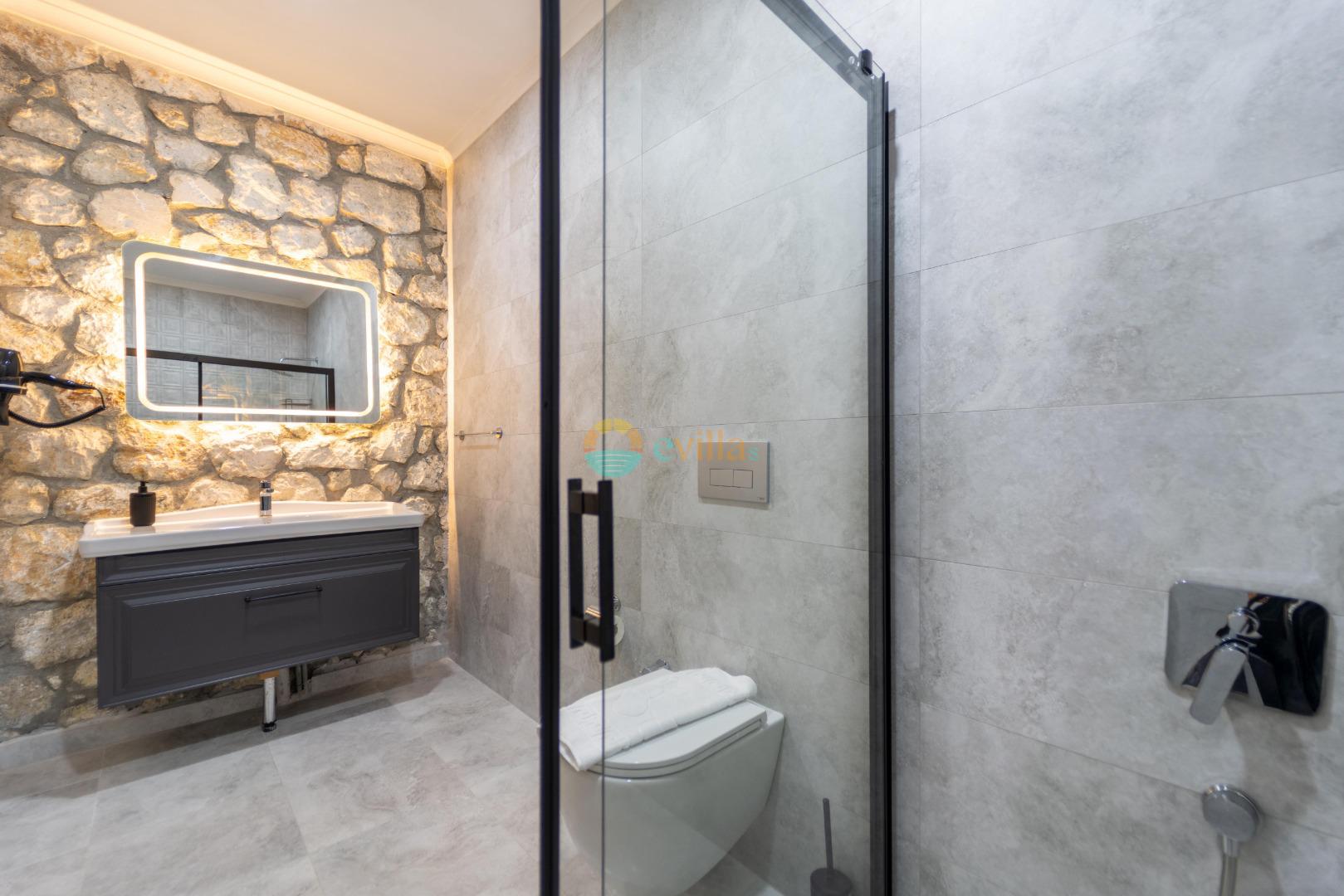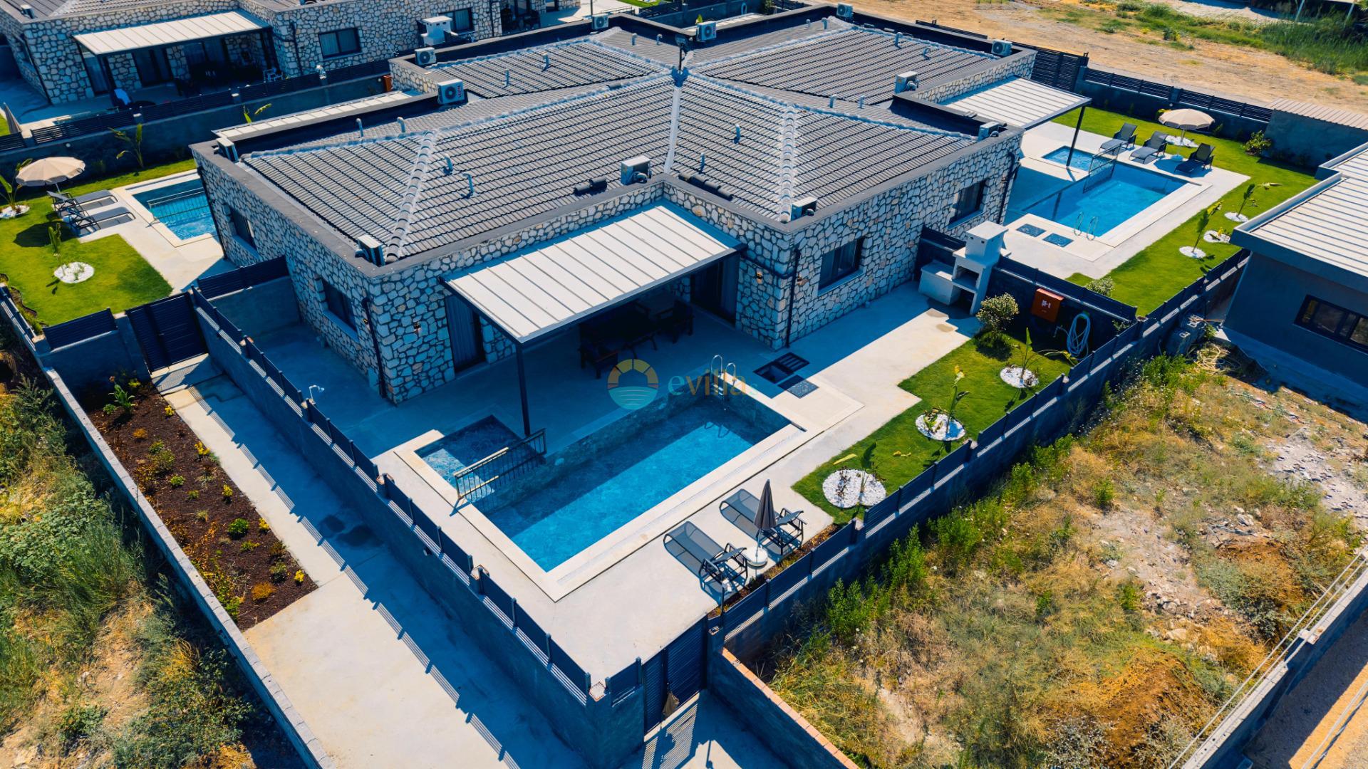 Taş mimariye sahip villamız 4 kişi kapasiteli olup içerisinde 2 yatak odası ve 2 WC-DUŞ mevcuttur. Girişte açık mutfak, salon, TV ve klima yer almaktadır. Birinci yatak odası içerisinde iki tek kişilik yatak, WC-DUŞ ve klima bulunurken, diğer oda içerisinde ise bir çift kişilik yatak, WC-DUŞ ve klima mevcuttur.